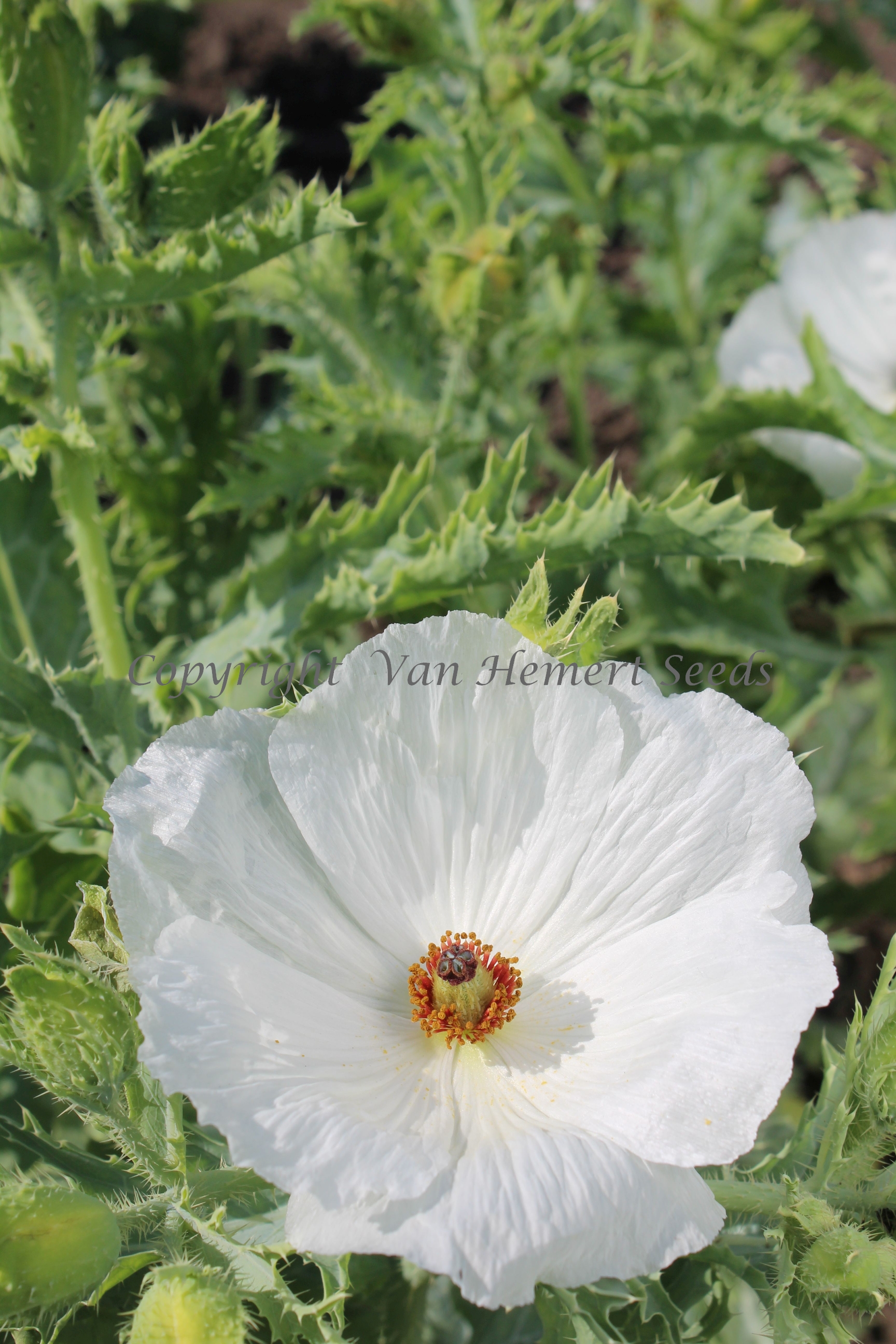 100420 - An amazing annual for white borders. The 10 cm / 4 in. large pure white satin flowers with dark red stamens carrying golden anthers, invite you for a closer look. But beware, every medal has two sides. The drawback of this one is the large number of spines on the leaves. Bees love the large single flowers: in dozens they visit the open flowers.