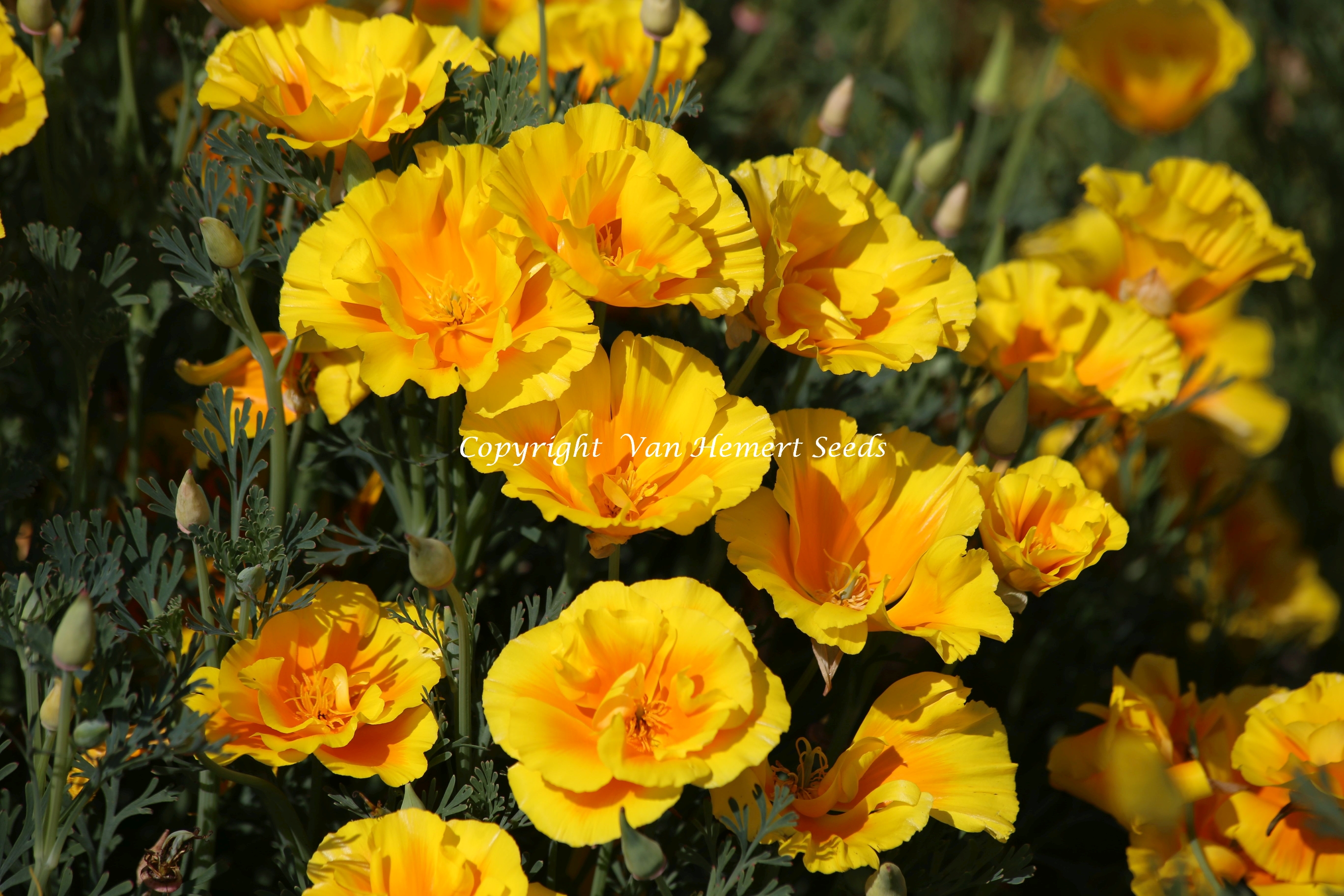 102110 - California poppy in an eye-catching two-tone, bright orange-golden bicolour. The petals have bright golden yellow tips and an orange-yellow centre. The slightly ruffled blooms sit above attractive fine blue-green feathery foliage. Eschscholzia is an easy to grow annual for direct sowing. Yukon Gold is spectacular when sown in drifts in sunny borders, but you can also use it to fill gaps in the border and in mixed plantings with other annuals.