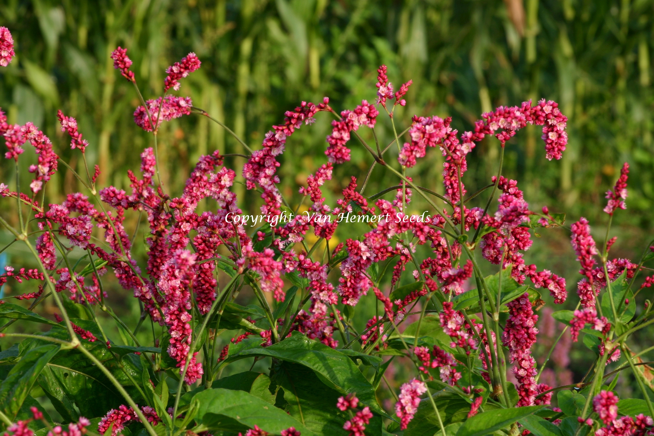 106310 - Kiss-me-over-the-garden-gate, Smartweed, Östlicher Knöterich Cerise Pearls is a shorter variety of this extraordinary tall annual. The plant has large heart-shaped leaves which create an exotic and impressive sight. The top of the branches curve down with a load of flower spikes of many rosy red blooms. Best when direct seeded in the garden, as germination is challenging.