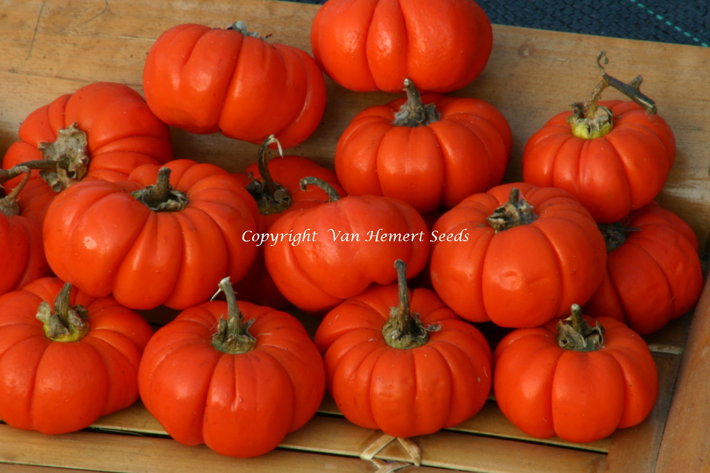 107388 - Eggplant heirloom variety. The oval shaped fruits grow in small clusters together; fruit size is 6 cm / 2.5 in. The fruit start green with darker green stripes later turning yellow and beautiful glossy orange with green stripes. Highly decorative for flower arrangements and fruit plates. The small fruits are edible.