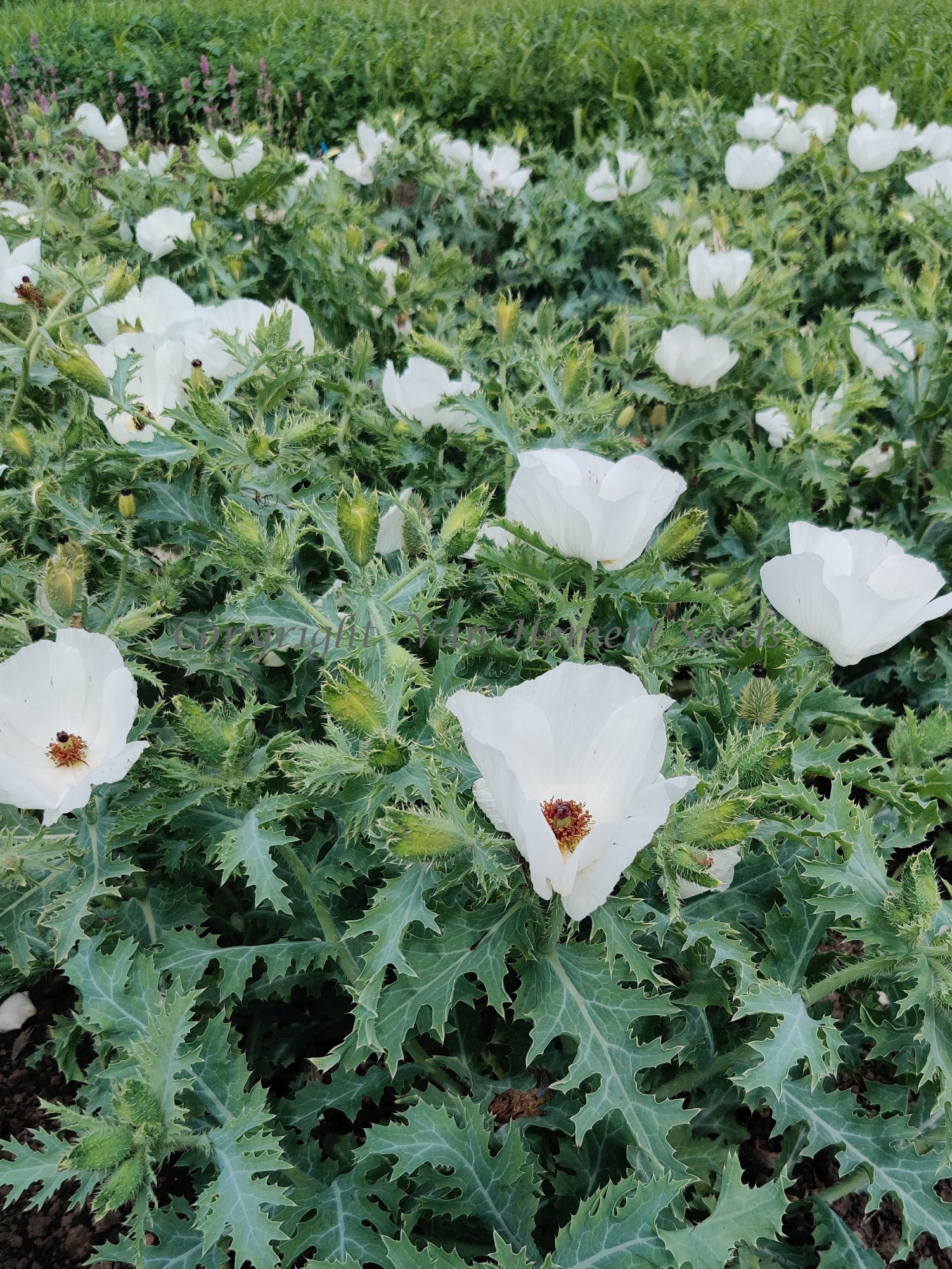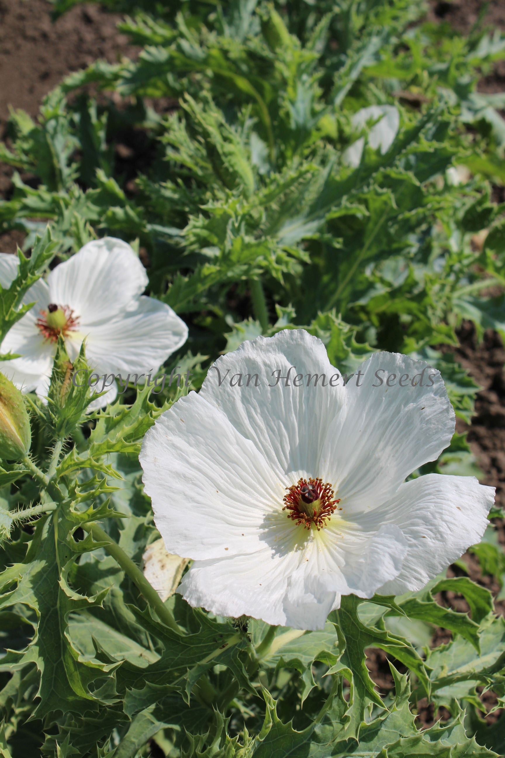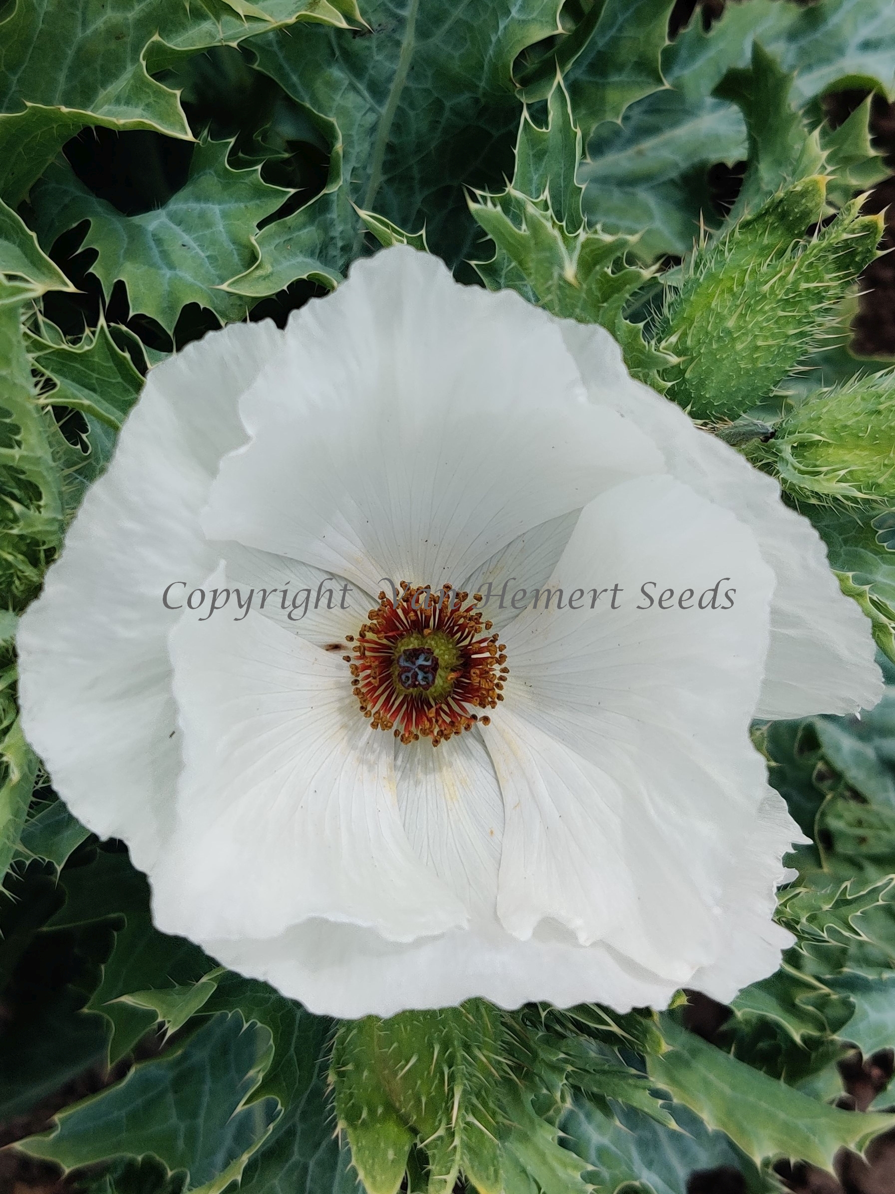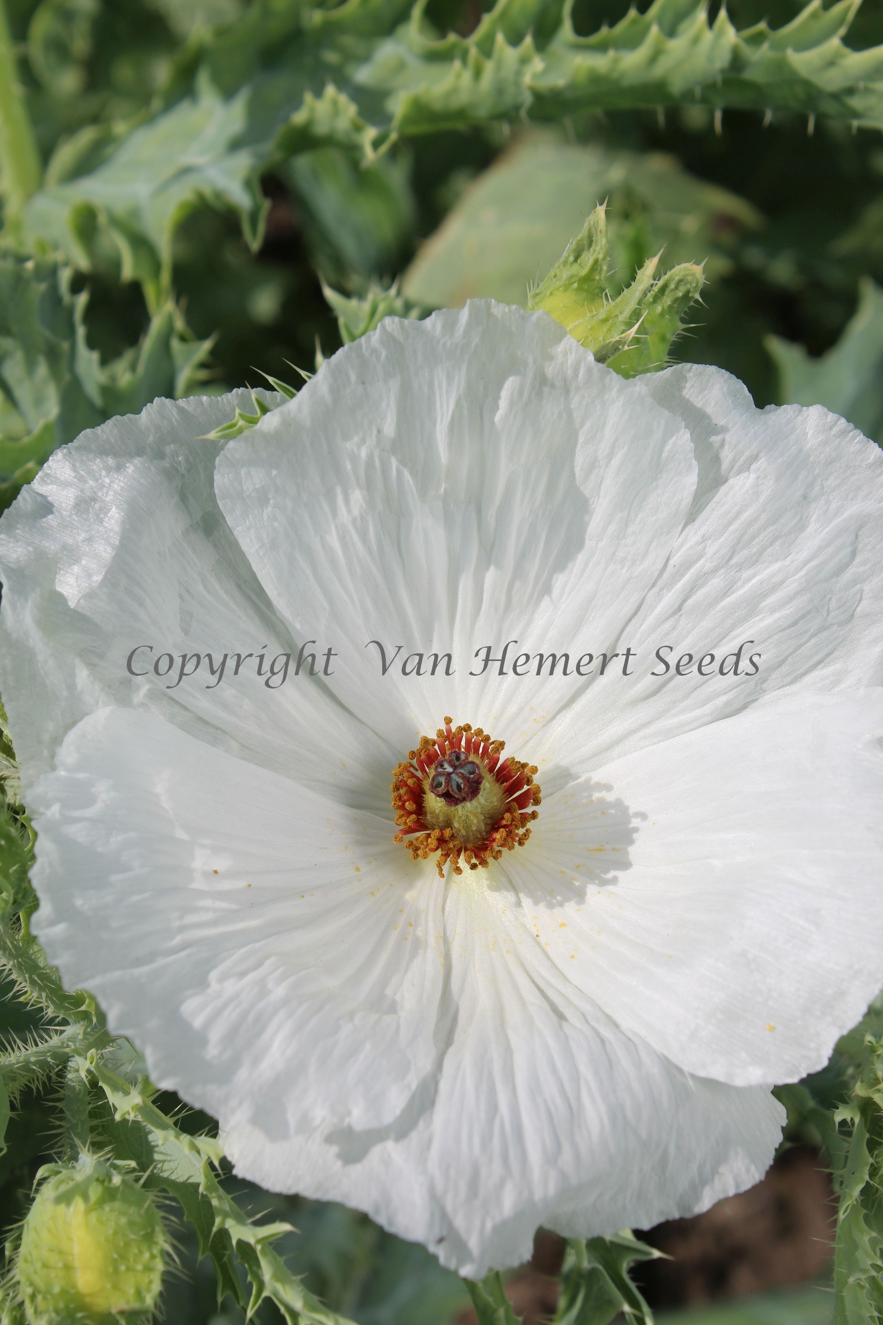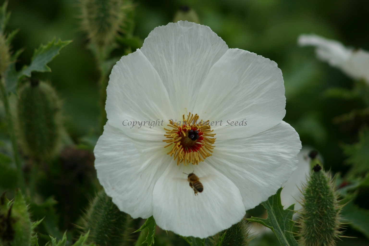 100420 - An amazing annual for white borders. The 10 cm / 4 in. large pure white satin flowers with dark red stamens carrying golden anthers, invite you for a closer look. But beware, every medal has two sides. The drawback of this one is the large number of spines on the leaves. Bees love the large single flowers: in dozens they visit the open flowers.