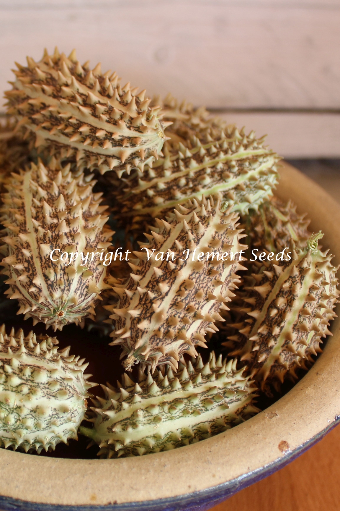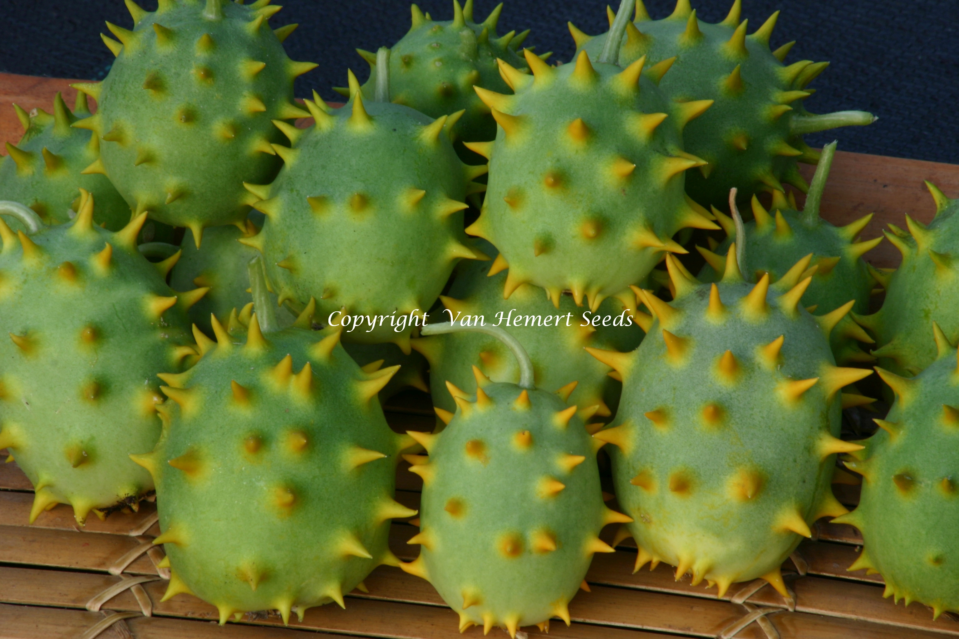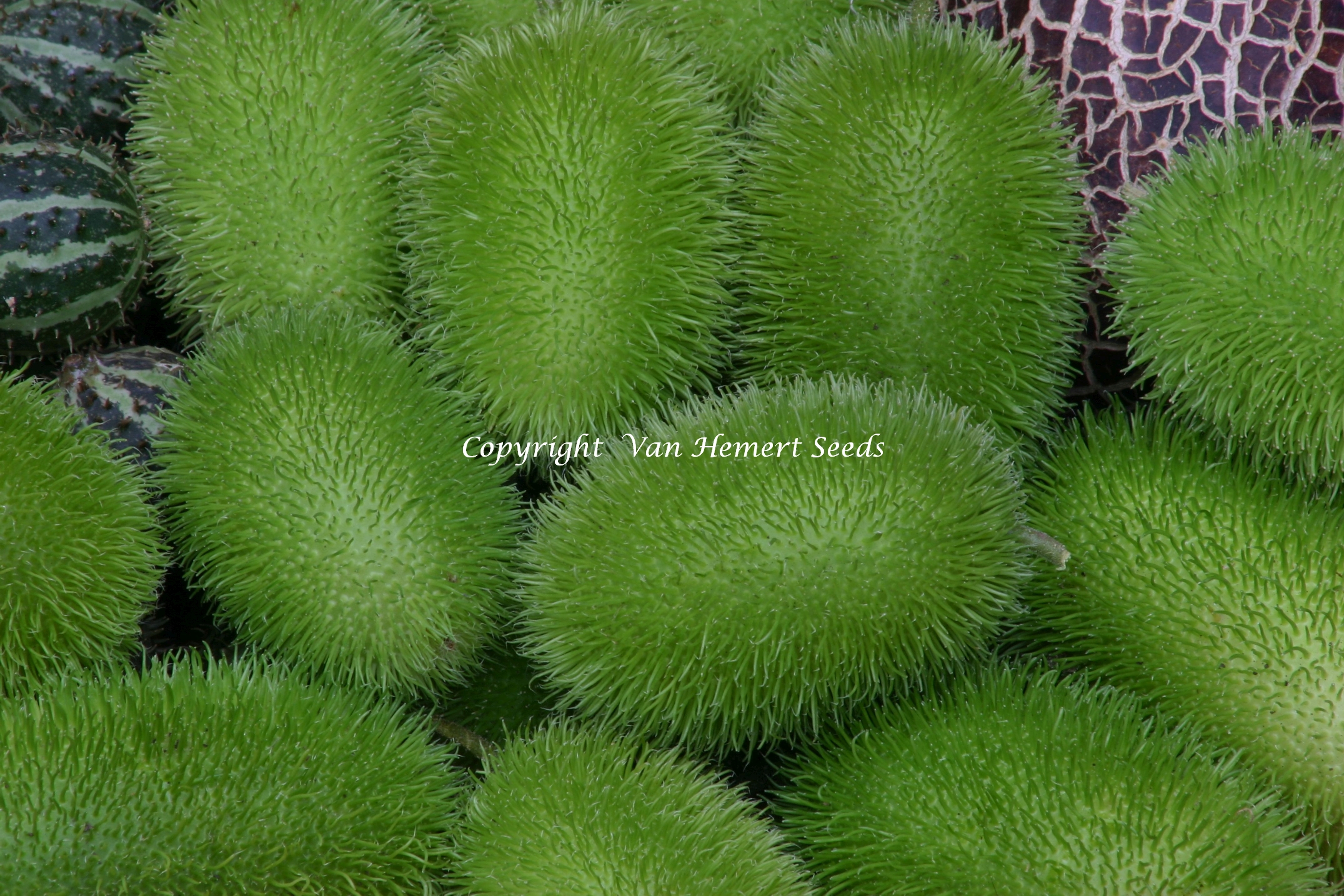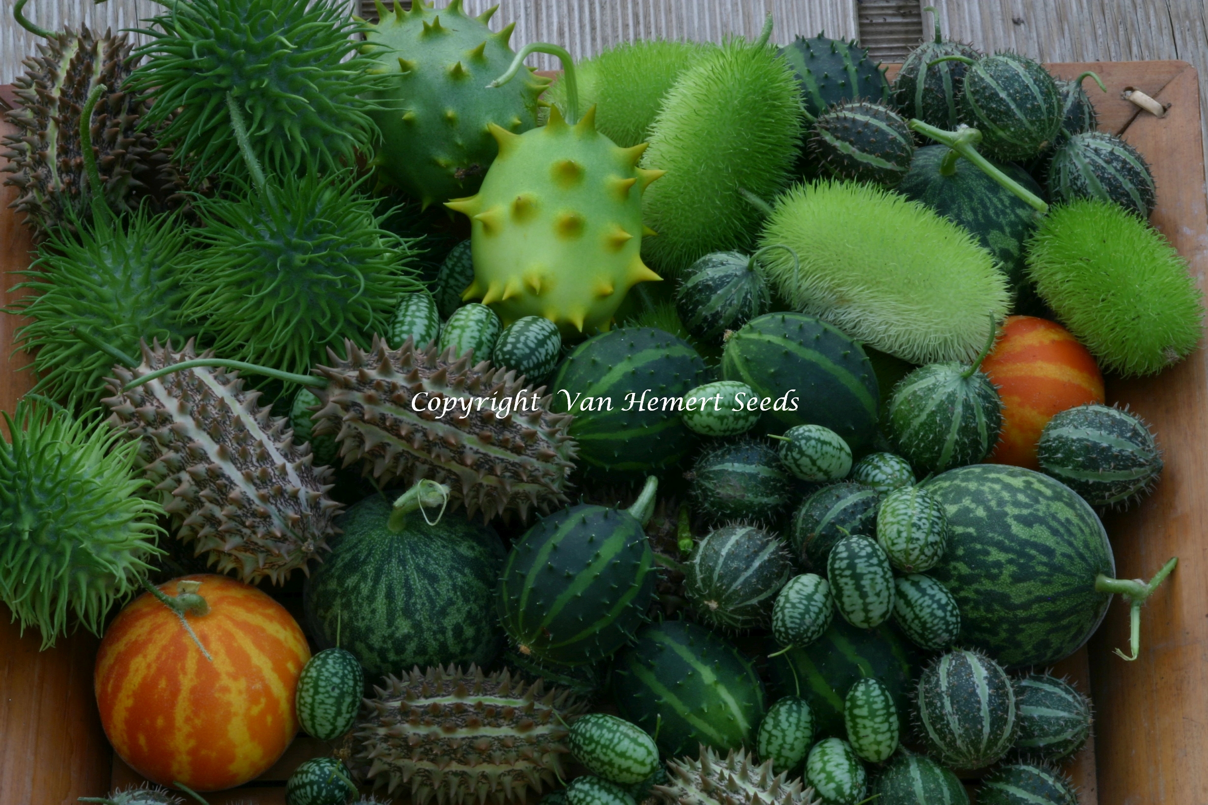 Ornamental or deco-cucumbers in all kinds of shapes and colours. The fruits do not look like the usual edible cucumbers and are for ornamental use only. Fruits are used as, or in combination with, small pumpkins in decorations in autumn, fruit plates, flower arrangements etc. Culture is easy, grow on a warm, sheltered site as climber or trailing plant, the average plant spread is 120-180 cm / 47-70 in. Harvest the fruits late summer, early autumn for decoration only. See also Zehneria scabra.