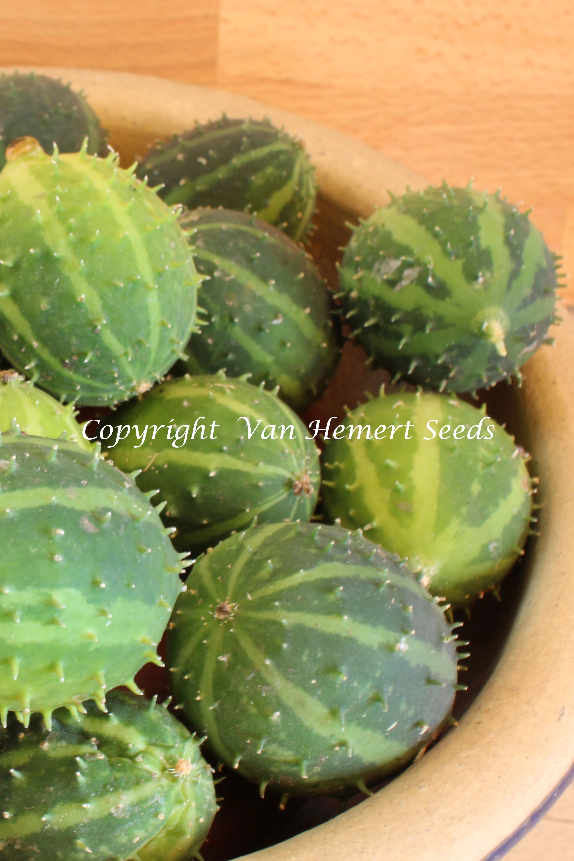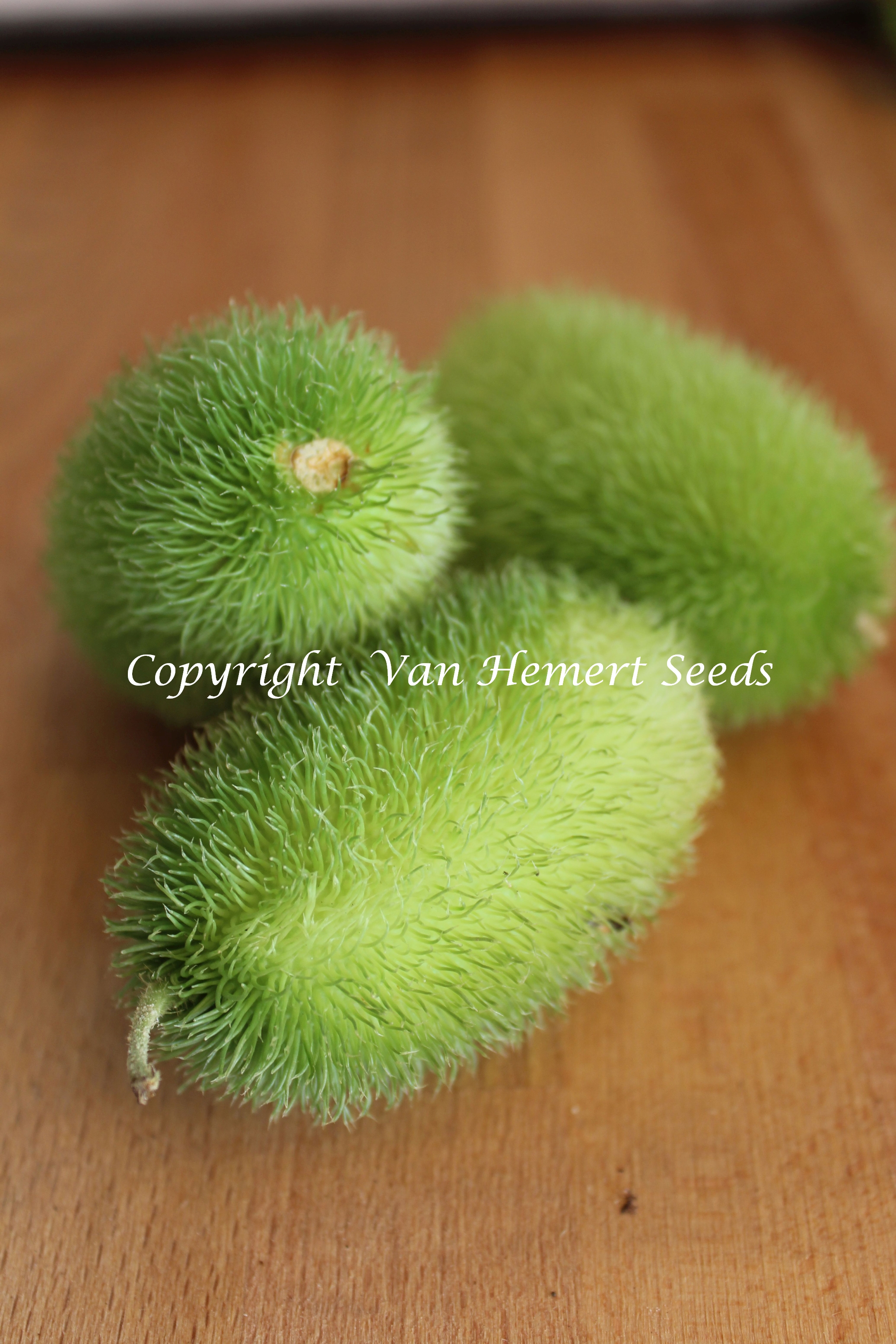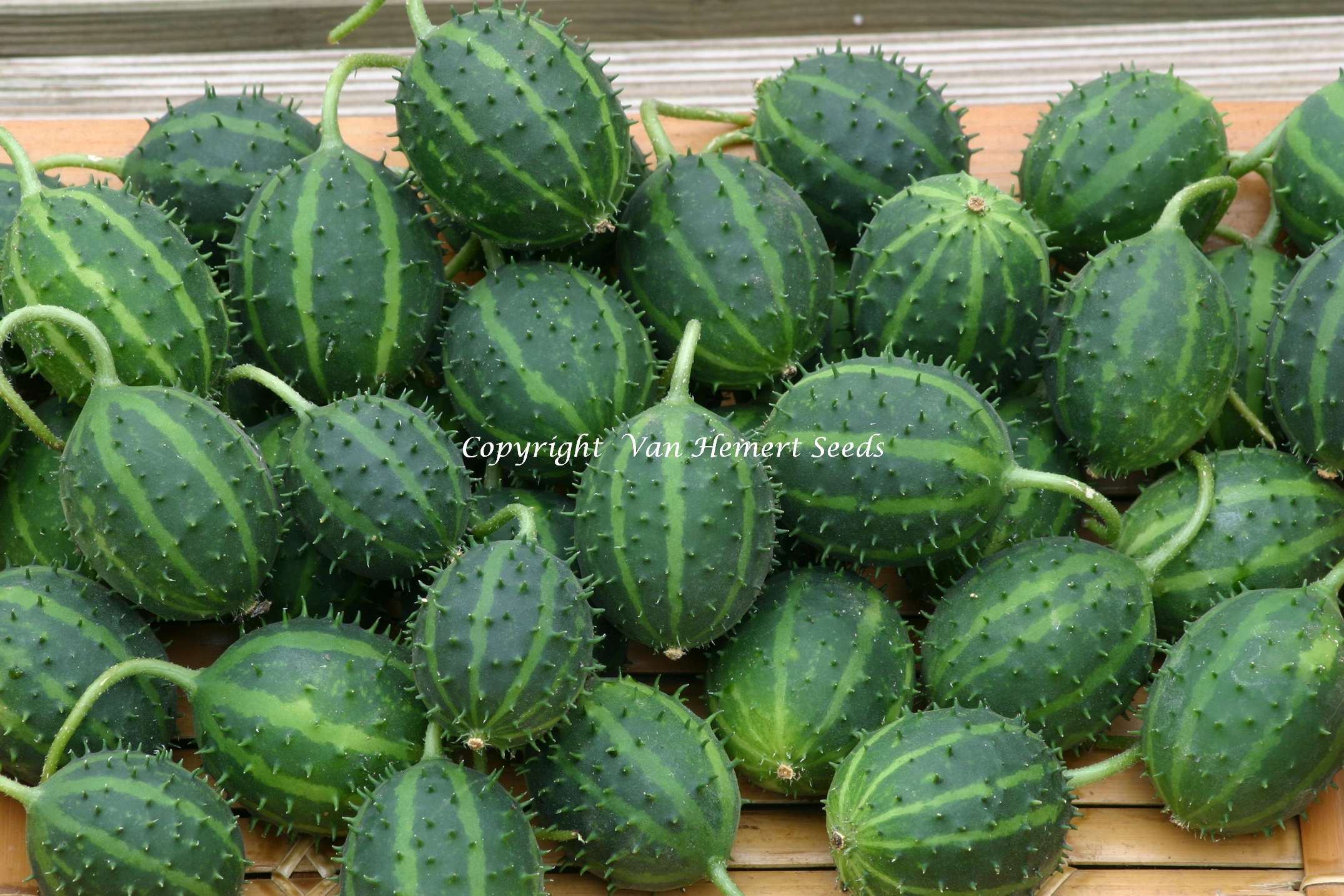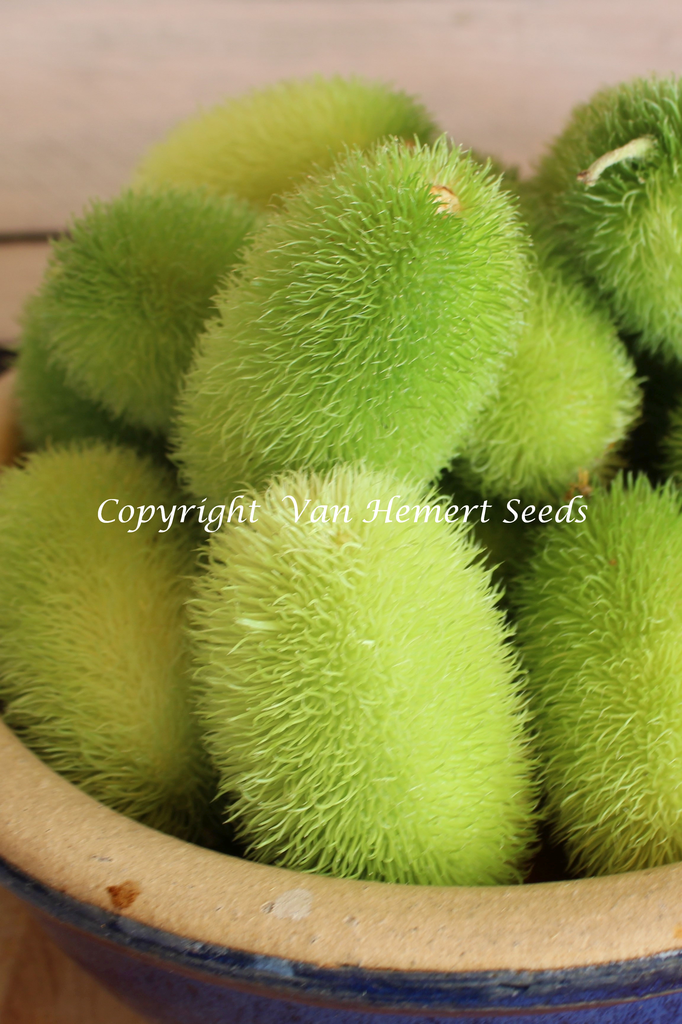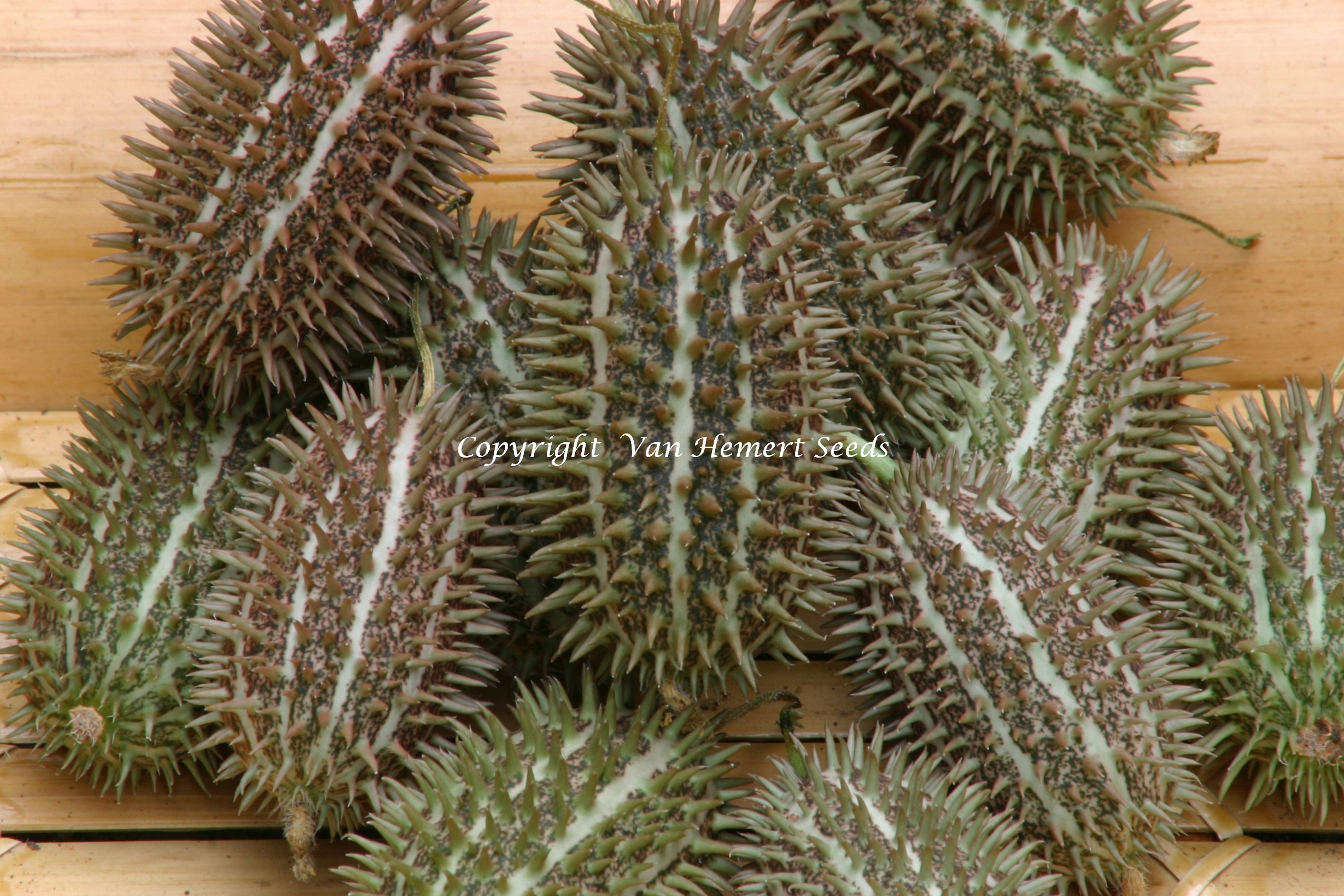 Ornamental or deco-cucumbers in all kinds of shapes and colours. The fruits do not look like the usual edible cucumbers and are for ornamental use only. Fruits are used as, or in combination with, small pumpkins in decorations in autumn, fruit plates, flower arrangements etc. Culture is easy, grow on a warm, sheltered site as climber or trailing plant, the average plant spread is 120-180 cm / 47-70 in. Harvest the fruits late summer, early autumn for decoration only. See also Zehneria scabra.