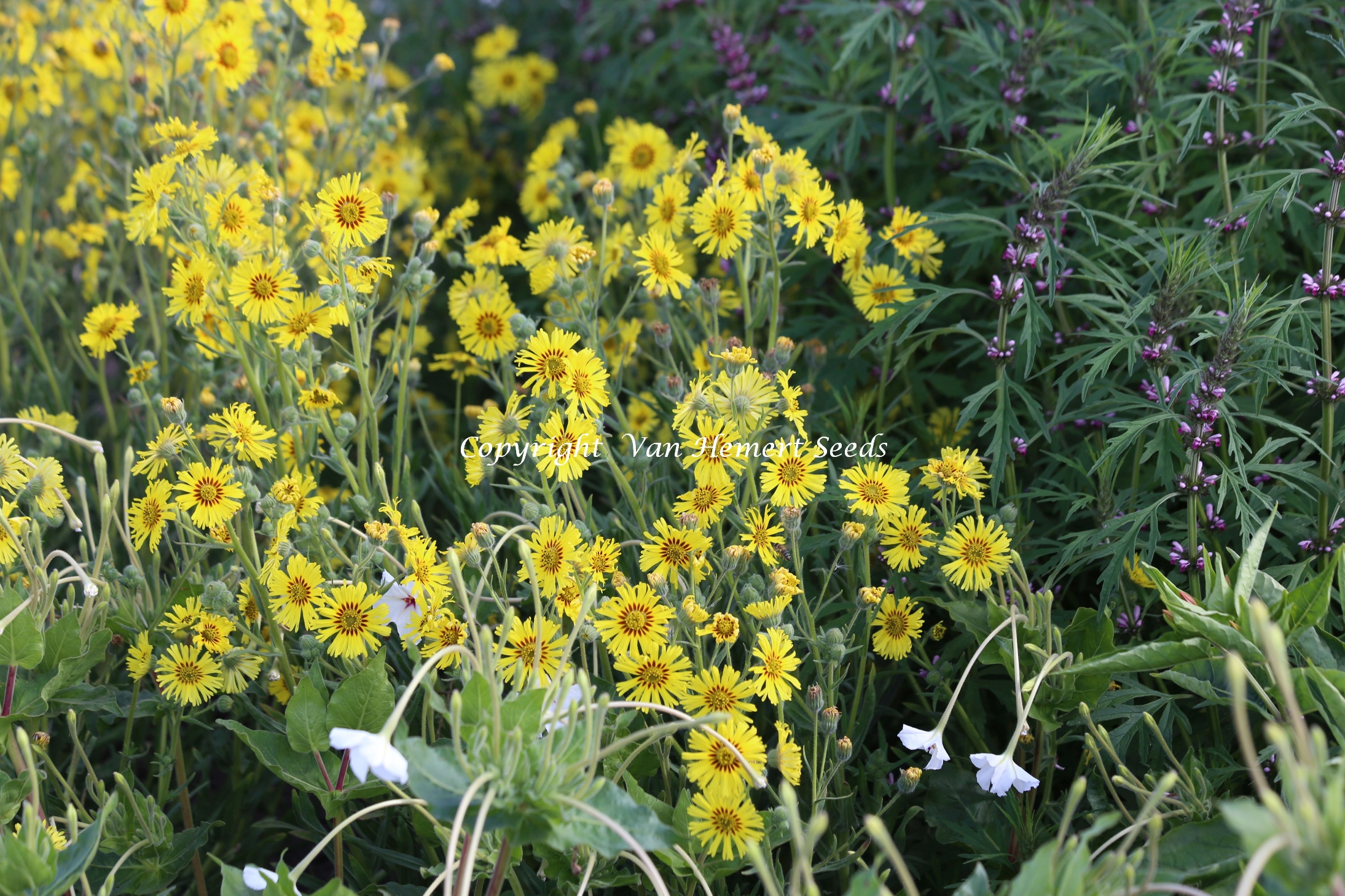 104950 - Common Tarweed. Deliciously fragrant annual. The intoxicating fragrance, resembling a tropical fruit cocktail, delights everyone coming close to it on a warm summer evening or early summer morning. Night flowering plants use fragrance to attract insects at night. Flowers are yellow with a maroon ring round the centre.