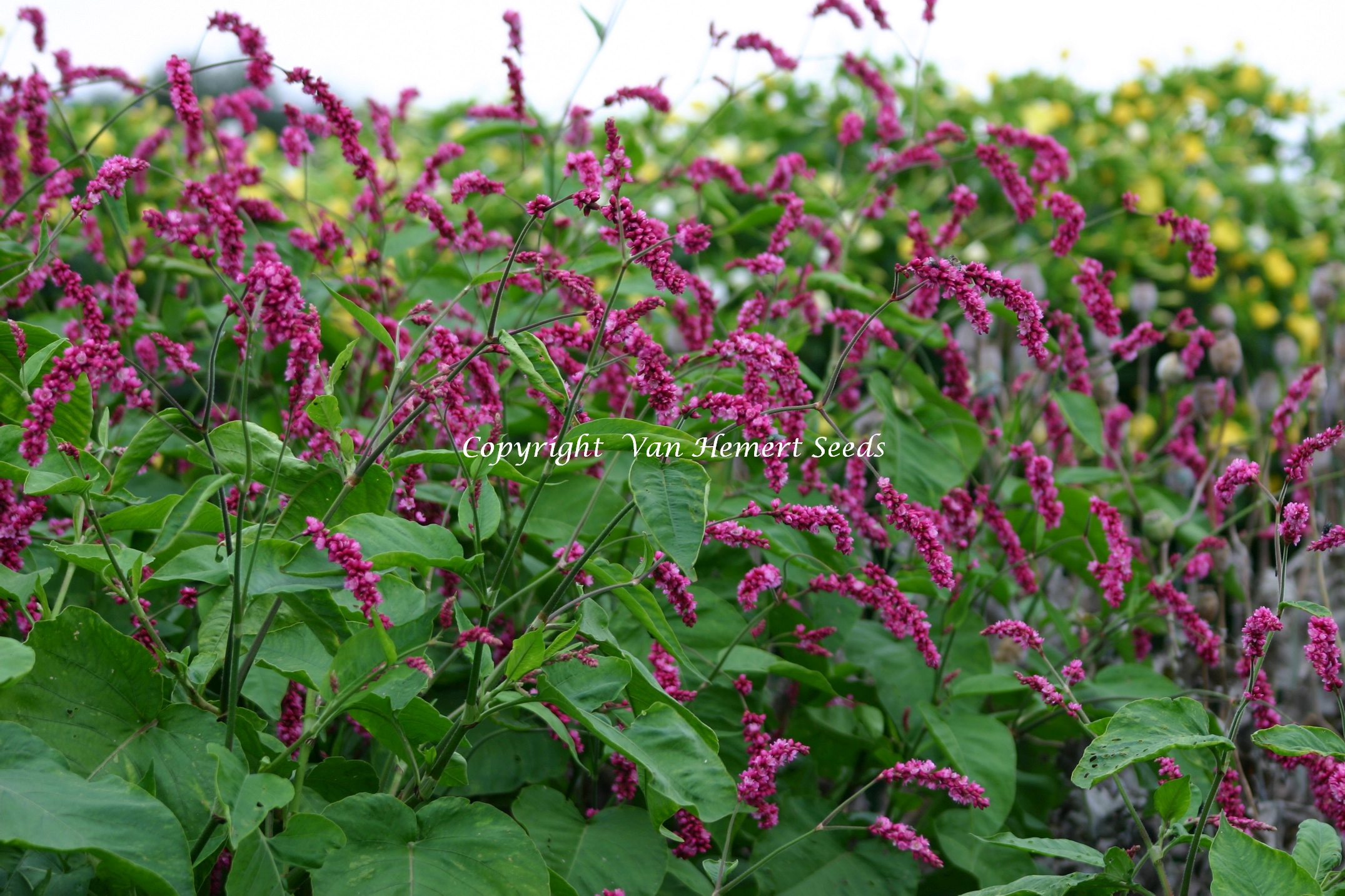 106310 - Kiss-me-over-the-garden-gate, Smartweed, Östlicher Knöterich Cerise Pearls is a shorter variety of this extraordinary tall annual. The plant has large heart-shaped leaves which create an exotic and impressive sight. The top of the branches curve down with a load of flower spikes of many rosy red blooms. Best when direct seeded in the garden, as germination is challenging.