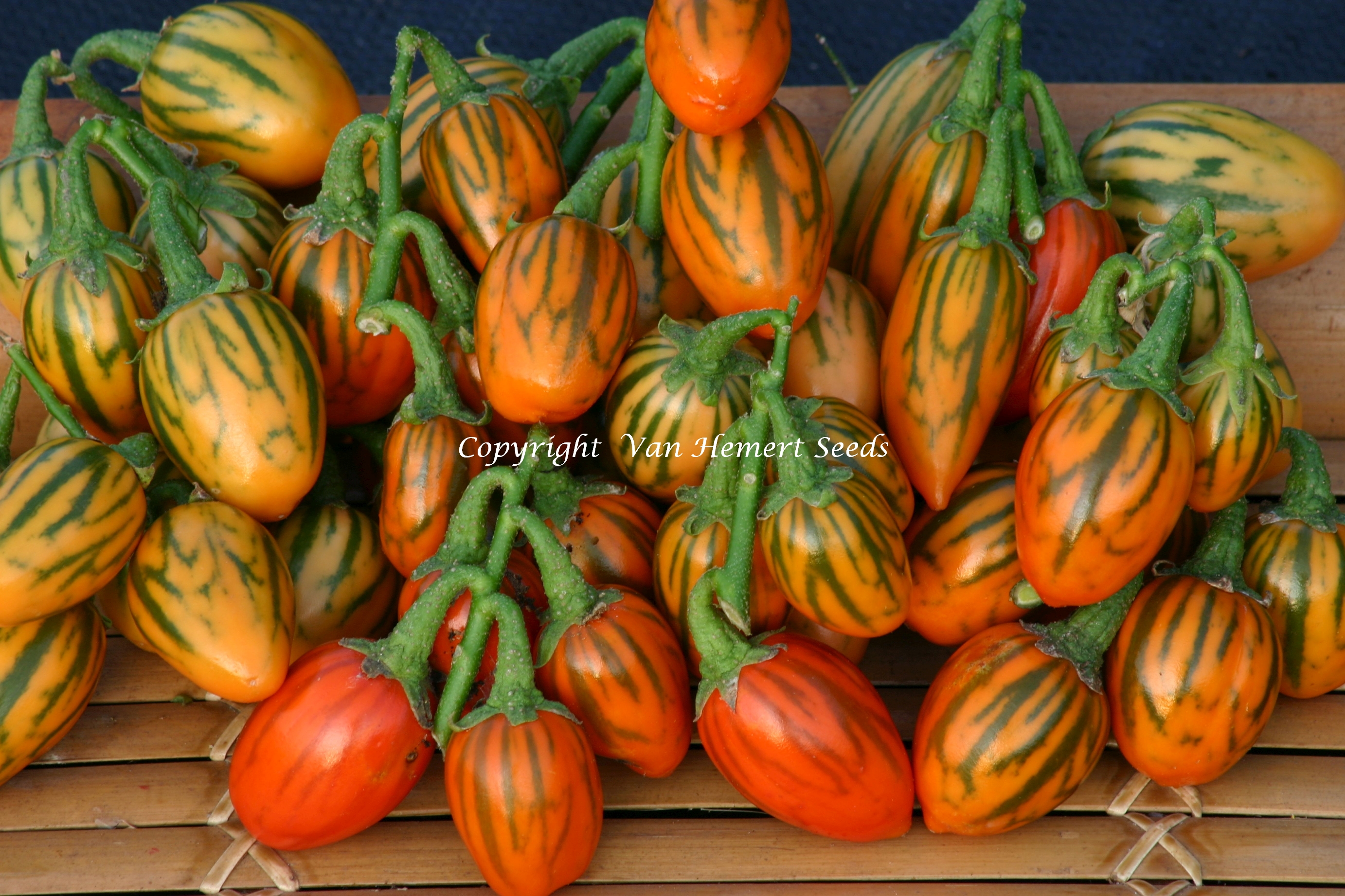 107388 - Eggplant heirloom variety. The oval shaped fruits grow in small clusters together; fruit size is 6 cm / 2.5 in. The fruit start green with darker green stripes later turning yellow and beautiful glossy orange with green stripes. Highly decorative for flower arrangements and fruit plates. The small fruits are edible.